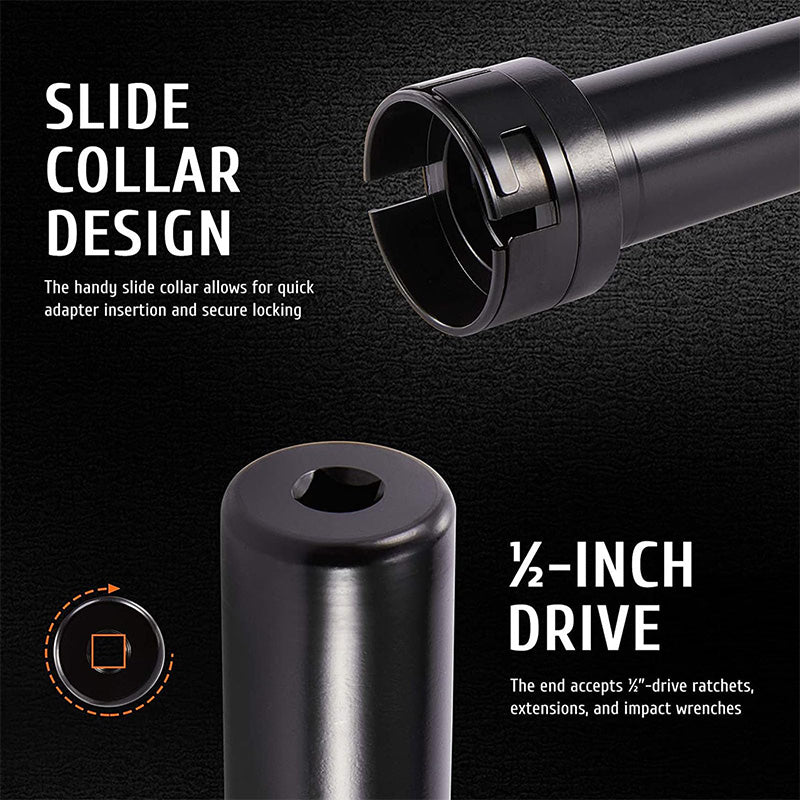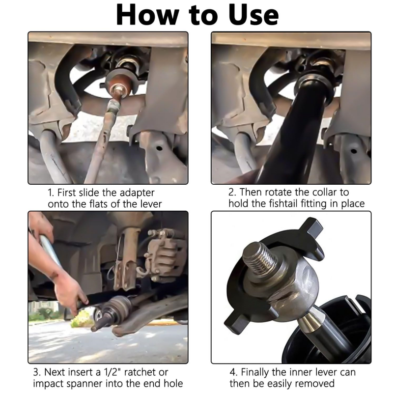 SIMPLE OPERATION: Select the correct adapter, secure it onto the tie rod, align the wrench notch with the adapter block, rotate the wrench's head collar to lock the adapter, and attach a drive tool at the end for seamless removal.