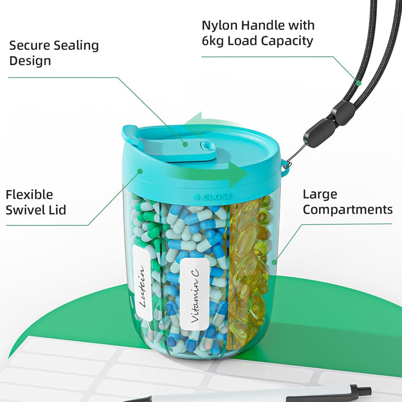 Klare Fächeretiketten und Sichtbarkeit: Dank des transparenten Designs können Sie die Dosierung auf einen Blick überprüfen. Schreiben Sie direkt auf jeden Abschnitt, um Zeiten oder Medikamente für mehr Klarheit zu kennzeichnen.